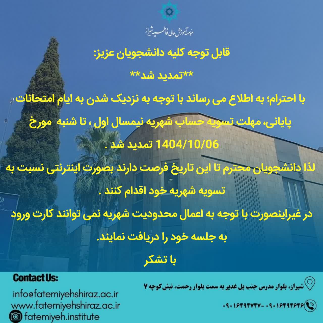 با احترام؛ به اطلاع می رساند با توجه به نزدیک شدن به ایام امتحانات پایانی، مهلت تسویه حساب شهریه نیمسال اول ، تا شنبه مورخ 1404/10/06 تمدید شد . لذا دانشجویان محترم تا این تاریخ فرصت دارند بصورت اینترنتی نسبت به تسویه شهریه خود اقدام کنند . در غیراینصورت با توجه به اعمال محدودیت شهریه نمی توانند کارت ورود به جلسه خود را دریافت نمایند.