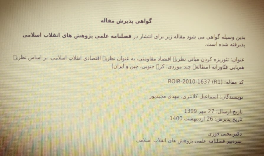 پذیرش مقاله دکتر کلانتری در مجله علمی پژوهشی پژوهشهای انقلاب اسلامی