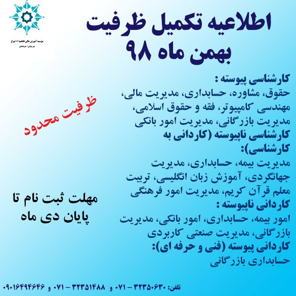 اطلاعیه تکمیل ظرفیت بهمن ماه ۹۸