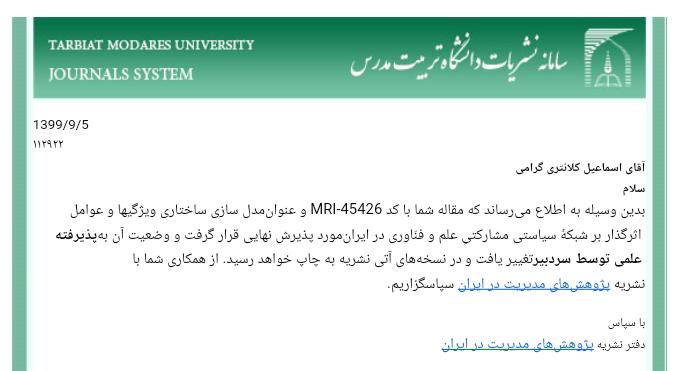 پذیرش مقاله پژوهشی دکتر کلانتری در مجله علمی پژوهشی «پژوهش های مدیریت در ایران»